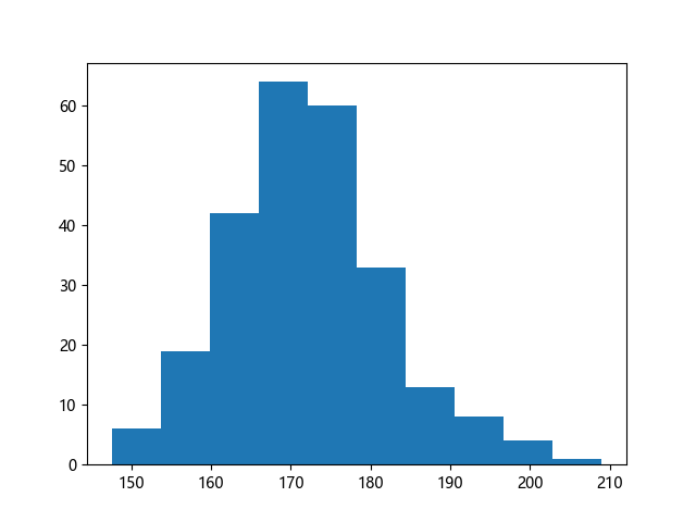 # 以下三行代码使编译器支持绘图功能: import sys import matplotlib matplotlib.use('Agg') import matplotlib.pyplot as plt import numpy as np # 生成正态分布数据: x = np.random.normal(170, 10, 250) # 均值 170,标准差 10,250 个数据点 # 绘制直方图: plt.hist(x) # 创建直方图 plt.show() # 显示图表 # 以下两行代码使编译器能够输出图形: plt.savefig(sys.stdout.buffer) sys.stdout.flush()