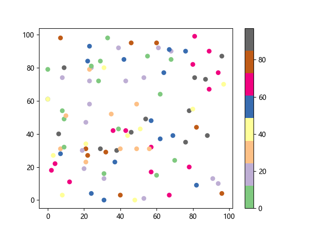 # 这三行代码使编译器能够绘图: import sys import matplotlib matplotlib.use('Agg') import matplotlib.pyplot as plt import numpy as np x = np.random.randint(100, size=(100)) y = np.random.randint(100, size=(100)) colors = np.random.randint(100, size=(100)) # 使用强调色系绘制散点图: plt.scatter(x, y, c=colors, cmap='Accent') plt.colorbar() plt.show() # 这两行代码使编译器能够输出图形: plt.savefig(sys.stdout.buffer) sys.stdout.flush()