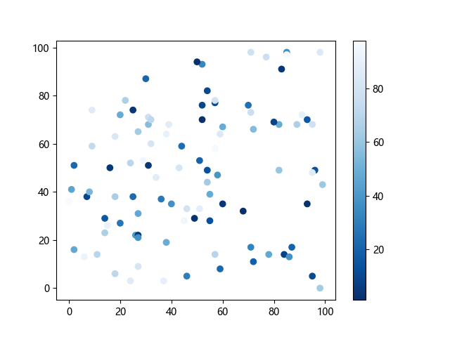 # 这三行代码使编译器能够绘图: import sys import matplotlib matplotlib.use('Agg') import matplotlib.pyplot as plt import numpy as np x = np.random.randint(100, size=(100)) y = np.random.randint(100, size=(100)) colors = np.random.randint(100, size=(100)) # 使用反向蓝色渐变绘制散点图: plt.scatter(x, y, c=colors, cmap='Blues_r') plt.colorbar() # 显示颜色条 plt.show() # 显示图形 # 这两行代码使编译器能够输出图形: plt.savefig(sys.stdout.buffer) sys.stdout.flush()