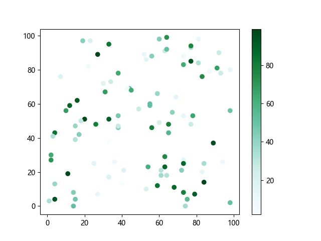 # 这三行代码使编译器能够绘图: import sys import matplotlib matplotlib.use('Agg') import matplotlib.pyplot as plt import numpy as np x = np.random.randint(100, size=(100)) y = np.random.randint(100, size=(100)) colors = np.random.randint(100, size=(100)) # 使用蓝绿色渐变绘制散点图: plt.scatter(x, y, c=colors, cmap='BuGn') plt.colorbar() # 显示颜色条 plt.show() # 显示图形 # 这两行代码使编译器能够输出图形: plt.savefig(sys.stdout.buffer) sys.stdout.flush()