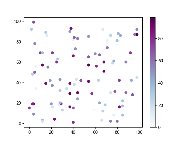 # 这三行代码使编译器能够绘图: import sys import matplotlib matplotlib.use('Agg') import matplotlib.pyplot as plt import numpy as np x = np.random.randint(100, size=(100)) y = np.random.randint(100, size=(100)) colors = np.random.randint(100, size=(100)) # 使用蓝紫色渐变绘制散点图: plt.scatter(x, y, c=colors, cmap='BuPu') plt.colorbar() # 显示颜色条 plt.show() # 显示图形 # 这两行代码使编译器能够输出图形: plt.savefig(sys.stdout.buffer) sys.stdout.flush()