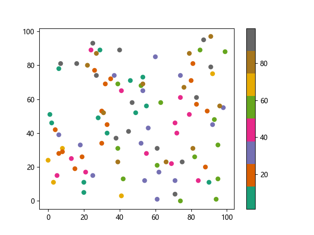 # 这三行代码使编译器能够绘图: import sys import matplotlib matplotlib.use('Agg') import matplotlib.pyplot as plt import numpy as np x = np.random.randint(100, size=(100)) y = np.random.randint(100, size=(100)) colors = np.random.randint(100, size=(100)) # 使用 Dark2 配色方案绘制散点图: plt.scatter(x, y, c=colors, cmap='Dark2') plt.colorbar() plt.show() # 这两行代码使编译器能够输出图形: plt.savefig(sys.stdout.buffer) sys.stdout.flush()
