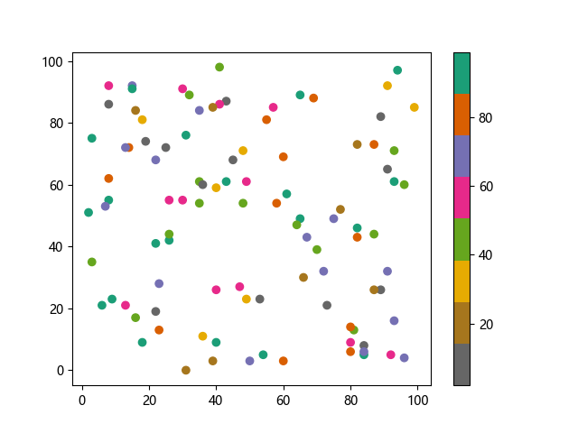 # 这三行代码使编译器能够绘图: import sys import matplotlib matplotlib.use('Agg') import matplotlib.pyplot as plt import numpy as np x = np.random.randint(100, size=(100)) y = np.random.randint(100, size=(100)) colors = np.random.randint(100, size=(100)) # 使用反向 Dark2 配色方案绘制散点图: plt.scatter(x, y, c=colors, cmap='Dark2_r') plt.colorbar() plt.show() # 这两行代码使编译器能够输出图形: plt.savefig(sys.stdout.buffer) sys.stdout.flush()