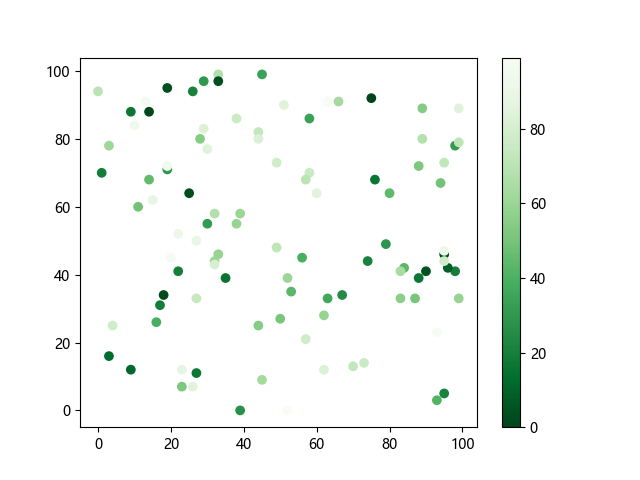 # 这三行代码使编译器能够绘图: import sys import matplotlib matplotlib.use('Agg') import matplotlib.pyplot as plt import numpy as np x = np.random.randint(100, size=(100)) y = np.random.randint(100, size=(100)) colors = np.random.randint(100, size=(100)) # 使用反向绿色渐变绘制散点图: plt.scatter(x, y, c=colors, cmap='Greens_r') plt.colorbar() plt.show() # 这两行代码使编译器能够输出图形: plt.savefig(sys.stdout.buffer) sys.stdout.flush()