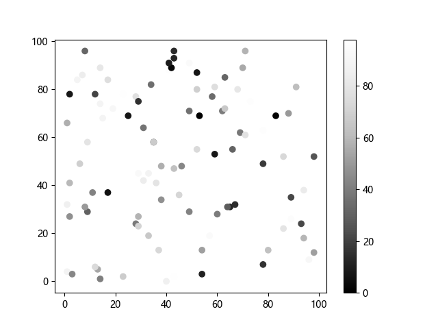 # 这三行代码使编译器能够绘图: import sys import matplotlib matplotlib.use('Agg') import matplotlib.pyplot as plt import numpy as np x = np.random.randint(100, size=(100)) y = np.random.randint(100, size=(100)) colors = np.random.randint(100, size=(100)) # 使用反向灰度渐变绘制散点图: plt.scatter(x, y, c=colors, cmap='Greys_r') plt.colorbar() plt.show() # 这两行代码使编译器能够输出图形: plt.savefig(sys.stdout.buffer) sys.stdout.flush()