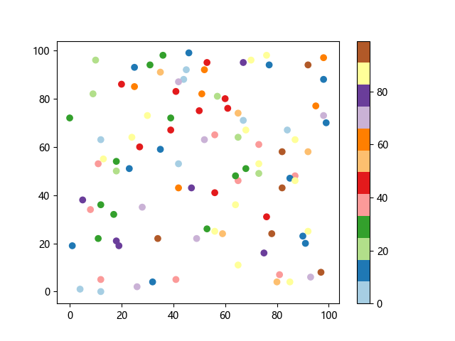 # 这三行代码使编译器能够绘图: import sys import matplotlib matplotlib.use('Agg') import matplotlib.pyplot as plt import numpy as np x = np.random.randint(100, size=(100)) y = np.random.randint(100, size=(100)) colors = np.random.randint(100, size=(100)) # 使用配对色系绘制散点图: plt.scatter(x, y, c=colors, cmap='Paired') plt.colorbar() plt.show() # 这两行代码使编译器能够输出图形: plt.savefig(sys.stdout.buffer) sys.stdout.flush()