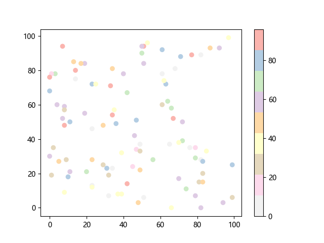 # 这三行代码使编译器能够绘图: import sys import matplotlib matplotlib.use('Agg') import matplotlib.pyplot as plt import numpy as np x = np.random.randint(100, size=(100)) y = np.random.randint(100, size=(100)) colors = np.random.randint(100, size=(100)) # 绘制反向 Pastel1 配色方案的散点图: plt.scatter(x, y, c=colors, cmap='Pastel1_r') plt.colorbar() plt.show() # 这两行代码使编译器能够输出图形: plt.savefig(sys.stdout.buffer) sys.stdout.flush()
