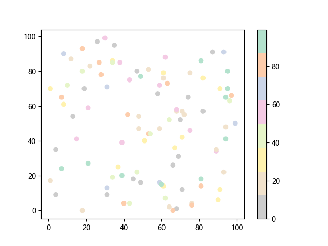 # 这三行代码使编译器能够绘图: import sys import matplotlib matplotlib.use('Agg') import matplotlib.pyplot as plt import numpy as np # 生成 100 个随机 x 坐标: x = np.random.randint(100, size=(100)) # 生成 100 个随机 y 坐标: y = np.random.randint(100, size=(100)) # 生成 100 个随机颜色值: colors = np.random.randint(100, size=(100)) # 绘制彩色散点图 plt.scatter(x, y, c=colors, cmap='Pastel2_r') plt.colorbar() # 显示颜色条 plt.show() # 显示图形 # 这两行代码使编译器能够输出图形: plt.savefig(sys.stdout.buffer) sys.stdout.flush()