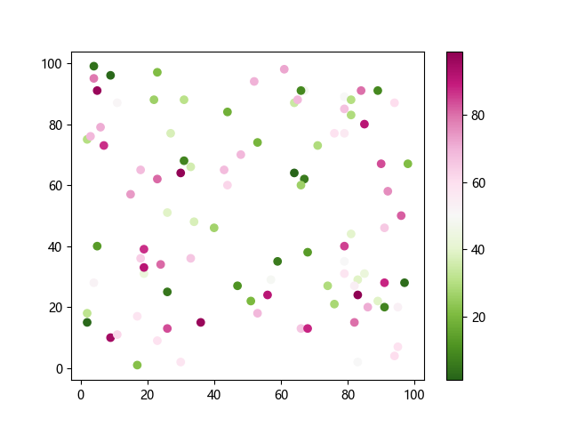 # 这三行代码使编译器能够绘图: import sys import matplotlib matplotlib.use('Agg') import matplotlib.pyplot as plt import numpy as np # 生成随机数据: x = np.random.randint(100, size=(100)) y = np.random.randint(100, size=(100)) colors = np.random.randint(100, size=(100)) # 使用 PiYG_r 配色方案绘制粉绿反向渐变色散点图: plt.scatter(x, y, c=colors, cmap='PiYG_r') plt.colorbar() # 显示颜色条 plt.show() # 显示图形 # 这两行代码使编译器能够输出图形: plt.savefig(sys.stdout.buffer) sys.stdout.flush()