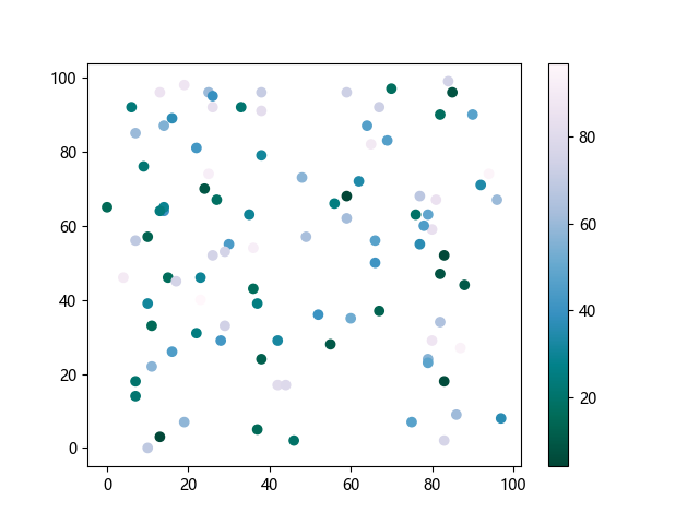 # 这三行代码使编译器能够绘图: import sys import matplotlib matplotlib.use('Agg') import matplotlib.pyplot as plt import numpy as np # 生成随机数据: x = np.random.randint(100, size=(100)) y = np.random.randint(100, size=(100)) colors = np.random.randint(100, size=(100)) # 使用 PuBuGn_r 配色方案绘制紫蓝绿反向渐变色散点图: plt.scatter(x, y, c=colors, cmap='PuBuGn_r') plt.colorbar() # 显示颜色条 plt.show() # 显示图形 # 这两行代码使编译器能够输出图形: plt.savefig(sys.stdout.buffer) sys.stdout.flush()