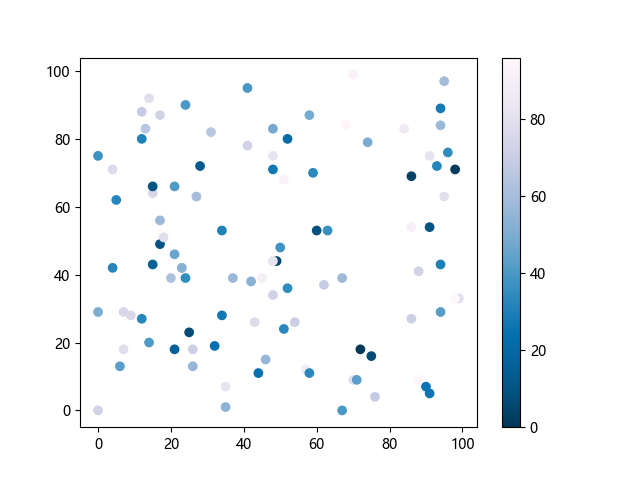 # 这三行代码使编译器能够绘图: import sys import matplotlib matplotlib.use('Agg') import matplotlib.pyplot as plt import numpy as np # 生成随机数据: x = np.random.randint(100, size=(100)) y = np.random.randint(100, size=(100)) colors = np.random.randint(100, size=(100)) # 使用 PuBu_r 配色方案绘制紫蓝色反向渐变色散点图: plt.scatter(x, y, c=colors, cmap='PuBu_r') plt.colorbar() # 显示颜色条 plt.show() # 显示图形 # 这两行代码使编译器能够输出图形: plt.savefig(sys.stdout.buffer) sys.stdout.flush()