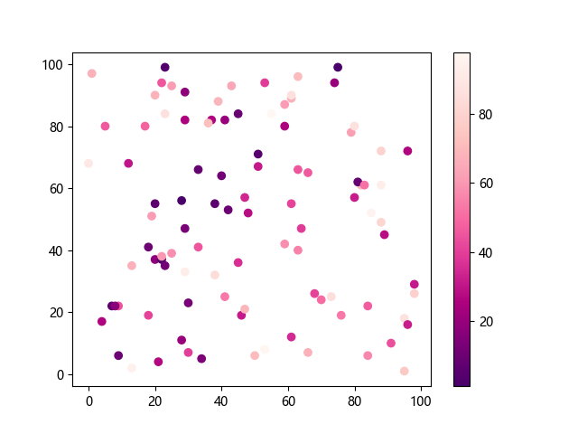 # 这三行代码使编译器能够绘图: import sys import matplotlib matplotlib.use('Agg') import matplotlib.pyplot as plt import numpy as np # 生成随机数据: x = np.random.randint(100, size=(100)) y = np.random.randint(100, size=(100)) colors = np.random.randint(100, size=(100)) # 使用 RdPu_r 配色方案绘制红紫色反向渐变色散点图: plt.scatter(x, y, c=colors, cmap='RdPu_r') plt.colorbar() # 显示颜色条 plt.show() # 显示图形 # 这两行代码使编译器能够输出图形: plt.savefig(sys.stdout.buffer) sys.stdout.flush()