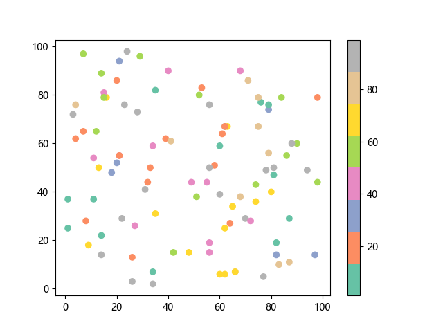 # 这三行代码使编译器能够绘图: import sys import matplotlib matplotlib.use('Agg') import matplotlib.pyplot as plt import numpy as np # 生成随机数据: x = np.random.randint(100, size=(100)) y = np.random.randint(100, size=(100)) colors = np.random.randint(100, size=(100)) # 使用 Set2 (8 色调色板)配色方案绘制 Set2 离散色散点图: plt.scatter(x, y, c=colors, cmap='Set2') plt.colorbar() # 显示颜色条 plt.show() # 显示图形 # 这两行代码使编译器能够输出图形: plt.savefig(sys.stdout.buffer) sys.stdout.flush()