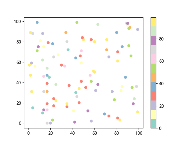 # 这三行代码使编译器能够绘图: import sys import matplotlib matplotlib.use('Agg') import matplotlib.pyplot as plt import numpy as np # 生成随机数据: x = np.random.randint(100, size=(100)) y = np.random.randint(100, size=(100)) colors = np.random.randint(100, size=(100)) # 使用 Set3 (12 色调色板)配色方案绘制 Set3 离散色散点图: plt.scatter(x, y, c=colors, cmap='Set3') plt.colorbar() # 显示颜色条 plt.show() # 显示图形 # 这两行代码使编译器能够输出图形: plt.savefig(sys.stdout.buffer) sys.stdout.flush()
