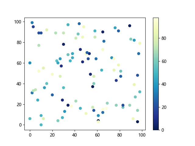 # 这三行代码使编译器能够绘图: import sys import matplotlib matplotlib.use('Agg') import matplotlib.pyplot as plt import numpy as np # 生成随机数据点: x = np.random.randint(100, size=(100)) y = np.random.randint(100, size=(100)) colors = np.random.randint(100, size=(100)) # 使用 YlGnBu_r (黄-绿-蓝反向渐变)配色方案绘制散点图: plt.scatter(x, y, c=colors, cmap='YlGnBu_r') plt.colorbar() # 显示颜色条 plt.show() # 显示图形 # 这两行代码使编译器能够输出图形: plt.savefig(sys.stdout.buffer) sys.stdout.flush()