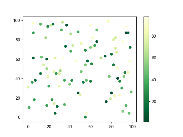 # 这三行代码使编译器能够绘图: import sys import matplotlib matplotlib.use('Agg') import matplotlib.pyplot as plt import numpy as np # 生成随机数据: x = np.random.randint(100, size=(100)) y = np.random.randint(100, size=(100)) colors = np.random.randint(100, size=(100)) # 使用YlGn_r(黄-绿反向渐变)配色方案绘制散点图: plt.scatter(x, y, c=colors, cmap='YlGn_r') plt.colorbar() # 显示颜色条 plt.show() # 显示图形 # 这两行代码使编译器能够输出图形: plt.savefig(sys.stdout.buffer) sys.stdout.flush()