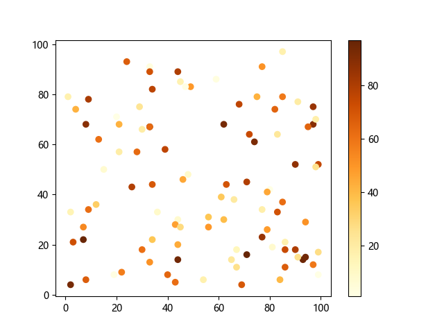 # 这三行代码使编译器能够绘图: import sys import matplotlib matplotlib.use('Agg') import matplotlib.pyplot as plt import numpy as np # 生成随机数据: x = np.random.randint(100, size=(100)) y = np.random.randint(100, size=(100)) colors = np.random.randint(100, size=(100)) # 使用 YlOrBr (黄-橙-棕渐变)配色方案绘制黄橙棕渐变散点图: plt.scatter(x, y, c=colors, cmap='YlOrBr') plt.colorbar() # 显示颜色条 plt.show() # 显示图形 # 这两行代码使编译器能够输出图形: plt.savefig(sys.stdout.buffer) sys.stdout.flush()