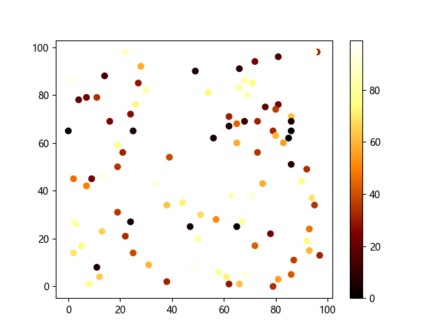 # 这三行代码使编译器能够绘图: import sys import matplotlib matplotlib.use('Agg') import matplotlib.pyplot as plt import numpy as np # 生成随机数据: x = np.random.randint(100, size=(100)) y = np.random.randint(100, size=(100)) colors = np.random.randint(100, size=(100)) # 使用 afmhot (热金属)配色方案绘制热金属色散点图: plt.scatter(x, y, c=colors, cmap='afmhot') plt.colorbar() # 显示颜色条 plt.show() # 显示图形 # 这两行代码使编译器能够输出图形: plt.savefig(sys.stdout.buffer) sys.stdout.flush()