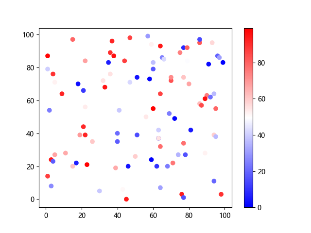 # 这三行代码使编译器能够绘图: import sys import matplotlib matplotlib.use('Agg') import matplotlib.pyplot as plt import numpy as np # 生成随机数据 x = np.random.randint(100, size=(100)) y = np.random.randint(100, size=(100)) colors = np.random.randint(100, size=(100)) # 使用 bwr 配色方案绘制蓝白红渐变色散点图: plt.scatter(x, y, c=colors, cmap='bwr') plt.colorbar() plt.show() # 这两行代码使编译器能够输出图形: plt.savefig(sys.stdout.buffer) sys.stdout.flush()