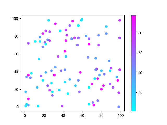 # 这三行代码使编译器能够绘图: import sys import matplotlib matplotlib.use('Agg') import matplotlib.pyplot as plt import numpy as np # 生成随机数据 x = np.random.randint(100, size=(100)) y = np.random.randint(100, size=(100)) colors = np.random.randint(100, size=(100)) # 使用 cool 配色方案绘制冷色调渐变色散点图: plt.scatter(x, y, c=colors, cmap='cool') plt.colorbar() plt.show() # 这两行代码使编译器能够输出图形: plt.savefig(sys.stdout.buffer) sys.stdout.flush()
