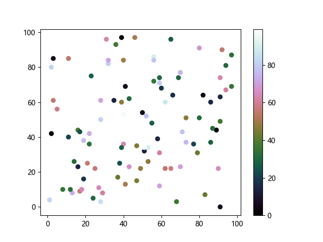 # 这三行代码使编译器能够绘图: import sys import matplotlib matplotlib.use('Agg') import matplotlib.pyplot as plt import numpy as np # 生成随机数据 x = np.random.randint(100, size=(100)) y = np.random.randint(100, size=(100)) colors = np.random.randint(100, size=(100)) # 使用 cubehelix 配色方案绘制螺旋立方体渐变色散点图: plt.scatter(x, y, c=colors, cmap='cubehelix') plt.colorbar() plt.show() # 这两行代码使编译器能够输出图形: plt.savefig(sys.stdout.buffer) sys.stdout.flush()