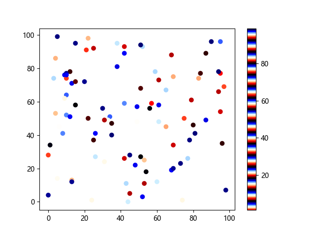 # 这三行代码使编译器能够绘图: import sys import matplotlib matplotlib.use('Agg') import matplotlib.pyplot as plt import numpy as np # 生成随机数据 x = np.random.randint(100, size=(100)) y = np.random.randint(100, size=(100)) colors = np.random.randint(100, size=(100)) # 使用 flag 配色方案绘制旗帜渐变色散点图: plt.scatter(x, y, c=colors, cmap='flag') plt.colorbar() plt.show() # 这两行代码使编译器能够输出图形: plt.savefig(sys.stdout.buffer) sys.stdout.flush()