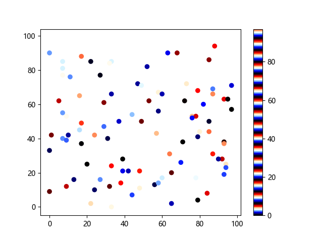 # 这三行代码使编译器能够绘图: import sys import matplotlib matplotlib.use('Agg') import matplotlib.pyplot as plt import numpy as np # 生成随机数据点 x = np.random.randint(100, size=(100)) y = np.random.randint(100, size=(100)) colors = np.random.randint(100, size=(100)) # 使用 flag_r 配色方案绘制旗帜反向渐变色散点图: plt.scatter(x, y, c=colors, cmap='flag_r') plt.colorbar() plt.show() # 这两行代码使编译器能够输出图形: plt.savefig(sys.stdout.buffer) sys.stdout.flush()