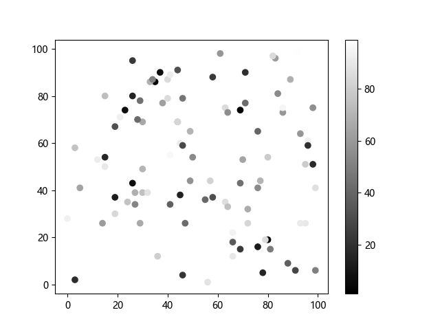 # 这三行代码使编译器能够绘图: import sys import matplotlib matplotlib.use('Agg') import matplotlib.pyplot as plt import numpy as np # 生成随机数据 x = np.random.randint(100, size=(100)) y = np.random.randint(100, size=(100)) colors = np.random.randint(100, size=(100)) # 使用 gist_gray 配色方案绘制灰度渐变色散点图: plt.scatter(x, y, c=colors, cmap='gist_gray') plt.colorbar() plt.show() # 这两行代码使编译器能够输出图形: plt.savefig(sys.stdout.buffer) sys.stdout.flush()