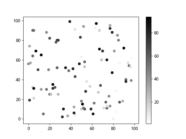# 这三行代码使编译器能够绘图: import sys import matplotlib matplotlib.use('Agg') import matplotlib.pyplot as plt import numpy as np # 生成随机数据点 x = np.random.randint(100, size=(100)) y = np.random.randint(100, size=(100)) colors = np.random.randint(100, size=(100)) # 使用 gist_gray_r 配色方案绘制灰度反向渐变色散点图: plt.scatter(x, y, c=colors, cmap='gist_gray_r') plt.colorbar() plt.show() # 这两行代码使编译器能够输出图形: plt.savefig(sys.stdout.buffer) sys.stdout.flush()