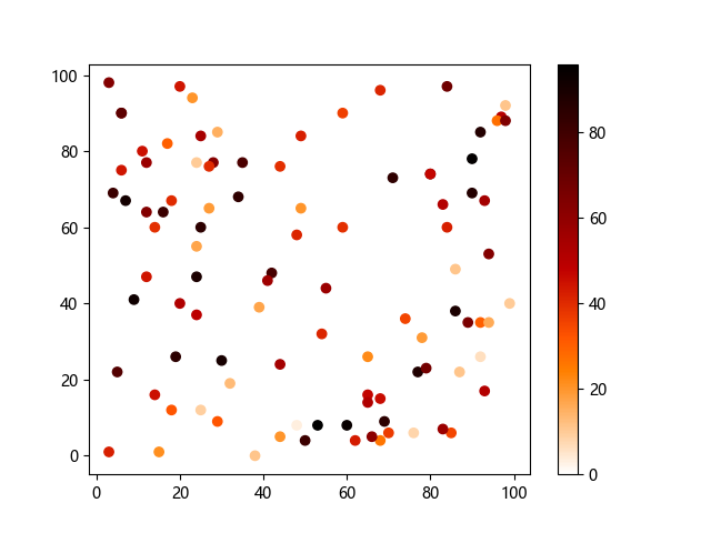 # 这三行代码使编译器能够绘图: import sys import matplotlib matplotlib.use('Agg') import matplotlib.pyplot as plt import numpy as np # 生成随机数据点 x = np.random.randint(100, size=(100)) y = np.random.randint(100, size=(100)) colors = np.random.randint(100, size=(100)) # 使用 gist_heat_r 配色方案绘制热力图反向渐变色散点图: plt.scatter(x, y, c=colors, cmap='gist_heat_r') plt.colorbar() plt.show() # 这两行代码使编译器能够输出图形: plt.savefig(sys.stdout.buffer) sys.stdout.flush()