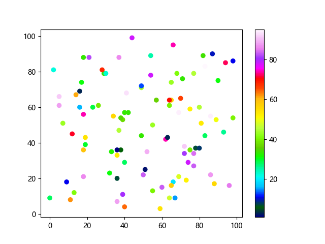 # 这三行代码使编译器能够绘图: import sys import matplotlib matplotlib.use('Agg') import matplotlib.pyplot as plt import numpy as np # 生成随机数据 x = np.random.randint(100, size=(100)) y = np.random.randint(100, size=(100)) colors = np.random.randint(100, size=(100)) # 使用 gist_ncar 配色方案绘制NCAR渐变色散点图: plt.scatter(x, y, c=colors, cmap='gist_ncar') plt.colorbar() plt.show() # 这两行代码使编译器能够输出图形: plt.savefig(sys.stdout.buffer) sys.stdout.flush()