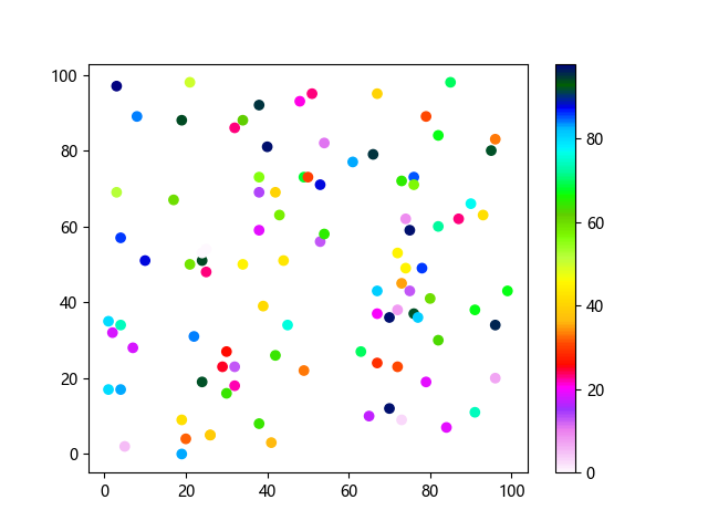 # 这三行代码使编译器能够绘图: import sys import matplotlib matplotlib.use('Agg') import matplotlib.pyplot as plt import numpy as np # 生成随机数据点 x = np.random.randint(100, size=(100)) y = np.random.randint(100, size=(100)) colors = np.random.randint(100, size=(100)) # 使用 gist_ncar_r 配色方案绘制 NCAR 反向渐变色散点图: plt.scatter(x, y, c=colors, cmap='gist_ncar_r') plt.colorbar() plt.show() # 这两行代码使编译器能够输出图形: plt.savefig(sys.stdout.buffer) sys.stdout.flush()