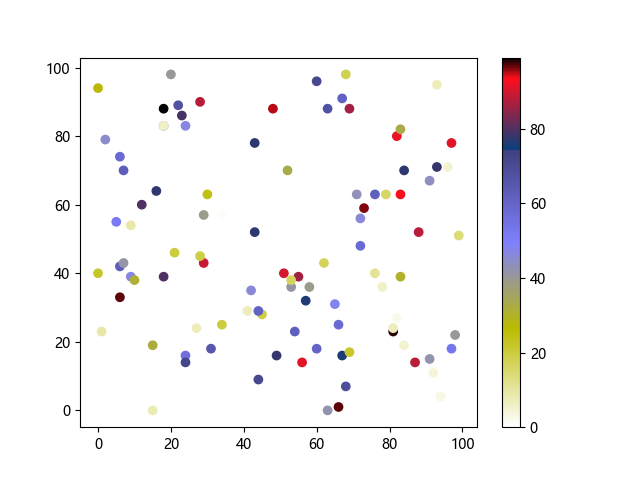 # 这三行代码使编译器能够绘图: import sys import matplotlib matplotlib.use('Agg') import matplotlib.pyplot as plt import numpy as np # 生成随机数据点 x = np.random.randint(100, size=(100)) y = np.random.randint(100, size=(100)) colors = np.random.randint(100, size=(100)) # 使用 gist_stern_r 配色方案绘制星云反向渐变色散点图: plt.scatter(x, y, c=colors, cmap='gist_stern_r') plt.colorbar() plt.show() # 这两行代码使编译器能够输出图形: plt.savefig(sys.stdout.buffer) sys.stdout.flush()