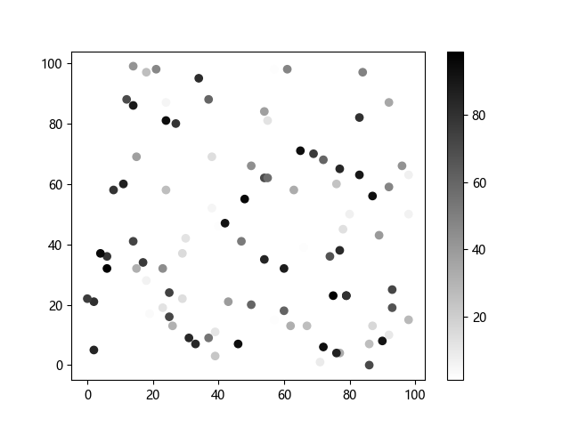 # 这三行代码使编译器能够绘图: import sys import matplotlib matplotlib.use('Agg') import matplotlib.pyplot as plt import numpy as np # 生成随机数据 x = np.random.randint(100, size=(100)) y = np.random.randint(100, size=(100)) colors = np.random.randint(100, size=(100)) # 使用 gist_yarg 配色方案绘制灰度渐变色散点图: plt.scatter(x, y, c=colors, cmap='gist_yarg') plt.colorbar() plt.show() # 这两行代码使编译器能够输出图形: plt.savefig(sys.stdout.buffer) sys.stdout.flush()