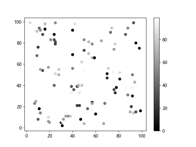 # 这三行代码使编译器能够绘图: import sys import matplotlib matplotlib.use('Agg') import matplotlib.pyplot as plt import numpy as np # 生成随机数据点 x = np.random.randint(100, size=(100)) y = np.random.randint(100, size=(100)) colors = np.random.randint(100, size=(100)) # 使用 gist_yarg_r 配色方案绘制灰度反向渐变色散点图: plt.scatter(x, y, c=colors, cmap='gist_yarg_r') plt.colorbar() plt.show() # 这两行代码使编译器能够输出图形: plt.savefig(sys.stdout.buffer) sys.stdout.flush()