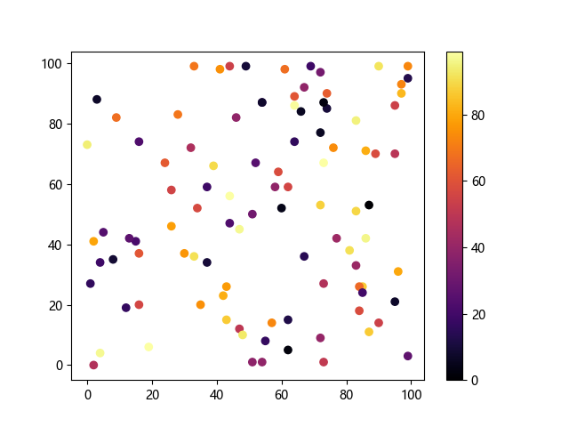 # 这三行代码使编译器能够绘图: import sys import matplotlib matplotlib.use('Agg') import matplotlib.pyplot as plt import numpy as np # 生成随机数据 x = np.random.randint(100, size=(100)) y = np.random.randint(100, size=(100)) colors = np.random.randint(100, size=(100)) # 使用 inferno 配色方案绘制地狱火渐变色散点图: plt.scatter(x, y, c=colors, cmap='inferno') plt.colorbar() plt.show() # 这两行代码使编译器能够输出图形: plt.savefig(sys.stdout.buffer) sys.stdout.flush()