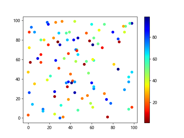# 这三行代码使编译器能够绘图: import sys import matplotlib matplotlib.use('Agg') import matplotlib.pyplot as plt import numpy as np # 生成随机数据点 x = np.random.randint(100, size=(100)) y = np.random.randint(100, size=(100)) colors = np.random.randint(100, size=(100)) # 使用 jet_r 配色方案绘制 Jet 反向渐变色散点图: plt.scatter(x, y, c=colors, cmap='jet_r') plt.colorbar() plt.show() # 这两行代码使编译器能够输出图形: plt.savefig(sys.stdout.buffer) sys.stdout.flush()