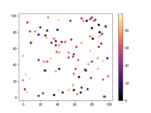 # 这三行代码使编译器能够绘图: import sys import matplotlib matplotlib.use('Agg') import matplotlib.pyplot as plt import numpy as np # 生成随机数据 x = np.random.randint(100, size=(100)) y = np.random.randint(100, size=(100)) colors = np.random.randint(100, size=(100)) # 使用 magma 配色方案绘制岩浆渐变色散点图: plt.scatter(x, y, c=colors, cmap='magma') plt.colorbar() plt.show() # 这两行代码使编译器能够输出图形: plt.savefig(sys.stdout.buffer) sys.stdout.flush()