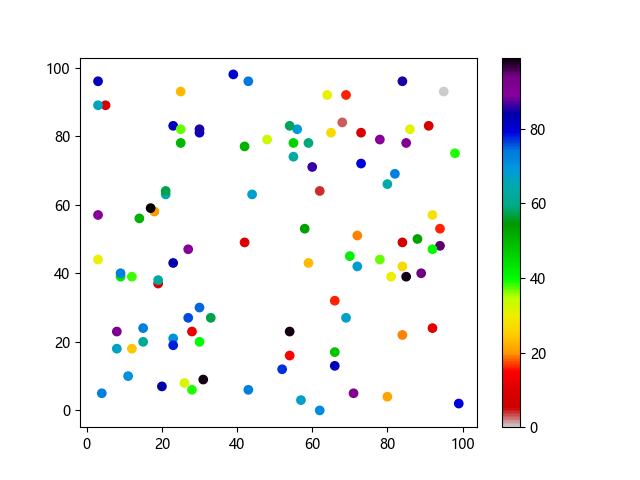 #Three lines to make our compiler able to draw: import sys import matplotlib matplotlib.use('Agg') import matplotlib.pyplot as plt import numpy as np x = np.random.randint(100, size=(100)) y = np.random.randint(100, size=(100)) colors = np.random.randint(100, size=(100)) plt.scatter(x, y, c=colors, cmap='nipy_spectral_r') plt.colorbar() plt.show() #Two lines to make our compiler able to draw: plt.savefig(sys.stdout.buffer) sys.stdout.flush()