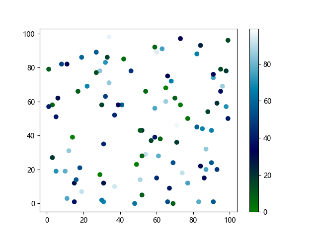 # 这三行代码使编译器能够绘图: import sys import matplotlib matplotlib.use('Agg') import matplotlib.pyplot as plt import numpy as np # 生成随机数据 x = np.random.randint(100, size=(100)) y = np.random.randint(100, size=(100)) colors = np.random.randint(100, size=(100)) # 使用 ocean 配色方案绘制海洋渐变色散点图: plt.scatter(x, y, c=colors, cmap='ocean') plt.colorbar() plt.show() # 这两行代码使编译器能够输出图形: plt.savefig(sys.stdout.buffer) sys.stdout.flush()