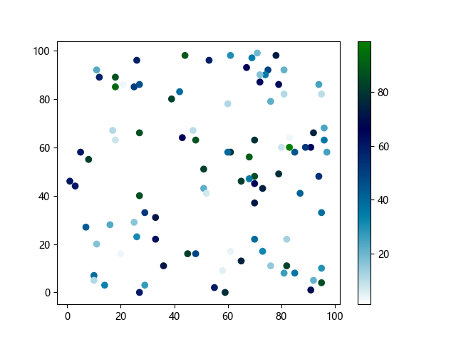 # 这三行代码使编译器能够绘图: import sys import matplotlib matplotlib.use('Agg') import matplotlib.pyplot as plt import numpy as np # 生成随机数据点 x = np.random.randint(100, size=(100)) y = np.random.randint(100, size=(100)) colors = np.random.randint(100, size=(100)) # 使用 ocean_r 配色方案绘制海洋色反向渐变色散点图: plt.scatter(x, y, c=colors, cmap='ocean_r') plt.colorbar() plt.show() # 这两行代码使编译器能够输出图形: plt.savefig(sys.stdout.buffer) sys.stdout.flush()