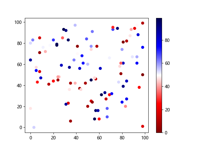# 以下三行代码使编译器支持绘图功能: import sys import matplotlib matplotlib.use('Agg') import matplotlib.pyplot as plt import numpy as np # 生成随机数据: x = np.random.randint(100, size=(100)) y = np.random.randint(100, size=(100)) colors = np.random.randint(100, size=(100)) # 使用 seismic 反向配色方案创建散点图: plt.scatter(x, y, c=colors, cmap='seismic_r') plt.colorbar() plt.show() # 以下两行代码使编译器能够输出图形: plt.savefig(sys.stdout.buffer) sys.stdout.flush()