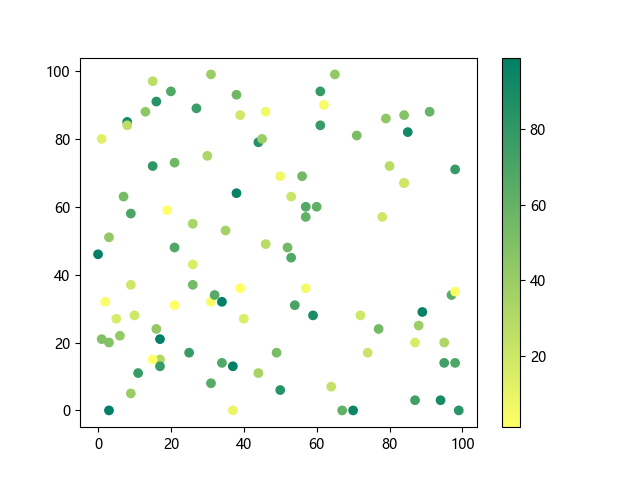 # 以下三行代码使编译器支持绘图功能: import sys import matplotlib matplotlib.use('Agg') import matplotlib.pyplot as plt import numpy as np # 生成随机数据: x = np.random.randint(100, size=(100)) y = np.random.randint(100, size=(100)) colors = np.random.randint(100, size=(100)) # 使用 summer 反向配色方案创建散点图: plt.scatter(x, y, c=colors, cmap='summer_r') plt.colorbar() plt.show() # 以下两行代码使编译器能够输出图形: plt.savefig(sys.stdout.buffer) sys.stdout.flush()