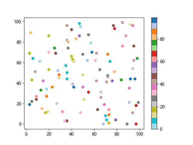 # 以下三行代码使编译器支持绘图功能: import sys import matplotlib matplotlib.use('Agg') import matplotlib.pyplot as plt import numpy as np # 生成随机数据: x = np.random.randint(100, size=(100)) y = np.random.randint(100, size=(100)) colors = np.random.randint(100, size=(100)) # 使用 tab20 反向离散配色方案创建散点图: plt.scatter(x, y, c=colors, cmap='tab20_r') plt.colorbar() plt.show() # 以下两行代码使编译器能够输出图形: plt.savefig(sys.stdout.buffer) sys.stdout.flush()