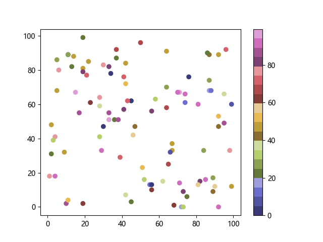 # 以下三行代码使编译器支持绘图功能: import sys import matplotlib matplotlib.use('Agg') import matplotlib.pyplot as plt import numpy as np # 生成随机数据: x = np.random.randint(100, size=(100)) y = np.random.randint(100, size=(100)) colors = np.random.randint(100, size=(100)) # 使用 tab20b 离散配色方案创建散点图: plt.scatter(x, y, c=colors, cmap='tab20b') plt.colorbar() plt.show() # 以下两行代码使编译器能够输出图形: plt.savefig(sys.stdout.buffer) sys.stdout.flush()