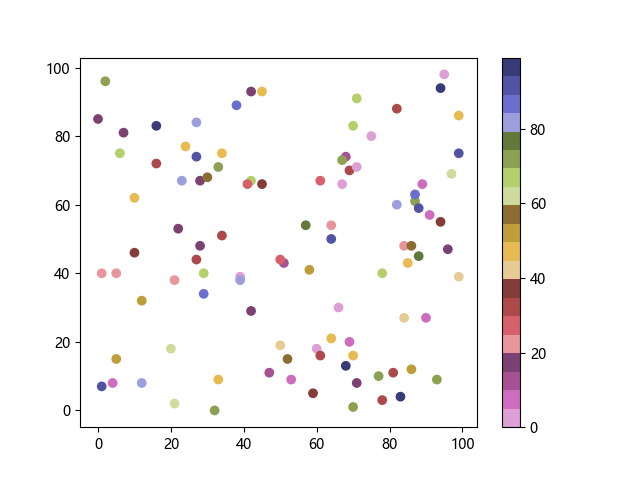 # 以下三行代码使编译器支持绘图功能: import sys import matplotlib matplotlib.use('Agg') import matplotlib.pyplot as plt import numpy as np # 生成随机数据: x = np.random.randint(100, size=(100)) y = np.random.randint(100, size=(100)) colors = np.random.randint(100, size=(100)) # 使用 tab20b 反向离散配色方案创建散点图: plt.scatter(x, y, c=colors, cmap='tab20b_r') plt.colorbar() plt.show() # 以下两行代码使编译器能够输出图形: plt.savefig(sys.stdout.buffer) sys.stdout.flush()