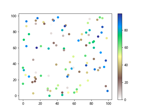 # 以下三行代码使编译器支持绘图功能: import sys import matplotlib matplotlib.use('Agg') import matplotlib.pyplot as plt import numpy as np # 生成随机数据: x = np.random.randint(100, size=(100)) y = np.random.randint(100, size=(100)) colors = np.random.randint(100, size=(100)) # 使用地形反向 (terrain_r) 配色方案创建散点图: plt.scatter(x, y, c=colors, cmap='terrain_r') plt.colorbar() plt.show() # 以下两行代码使编译器能够输出图形: plt.savefig(sys.stdout.buffer) sys.stdout.flush()