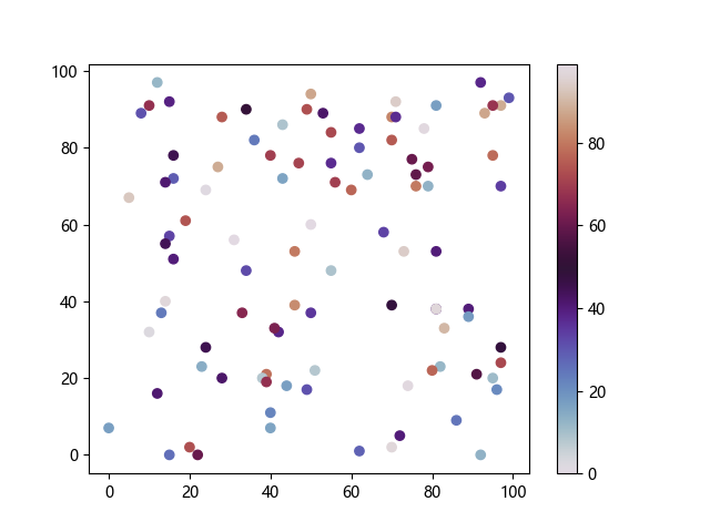 # 以下三行代码使编译器支持绘图功能: import sys import matplotlib matplotlib.use('Agg') import matplotlib.pyplot as plt import numpy as np # 生成随机数据: x = np.random.randint(100, size=(100)) y = np.random.randint(100, size=(100)) colors = np.random.randint(100, size=(100)) # 使用 twilight 配色方案创建散点图: plt.scatter(x, y, c=colors, cmap='twilight') plt.colorbar() plt.show() # 以下两行代码使编译器能够输出图形: plt.savefig(sys.stdout.buffer) sys.stdout.flush()