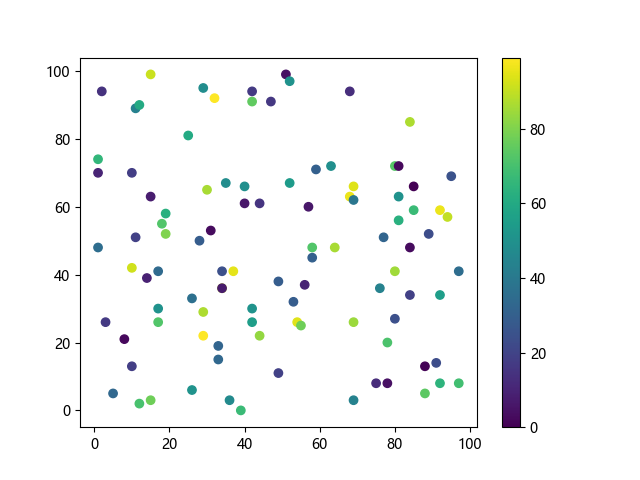 # 以下三行代码使编译器支持绘图功能: import sys import matplotlib matplotlib.use('Agg') import matplotlib.pyplot as plt import numpy as np # 生成随机数据: x = np.random.randint(100, size=(100)) y = np.random.randint(100, size=(100)) colors = np.random.randint(100, size=(100)) # 使用 viridis 配色方案创建散点图: plt.scatter(x, y, c=colors, cmap='viridis') plt.colorbar() plt.show() # 以下两行代码使编译器能够输出图形: plt.savefig(sys.stdout.buffer) sys.stdout.flush()