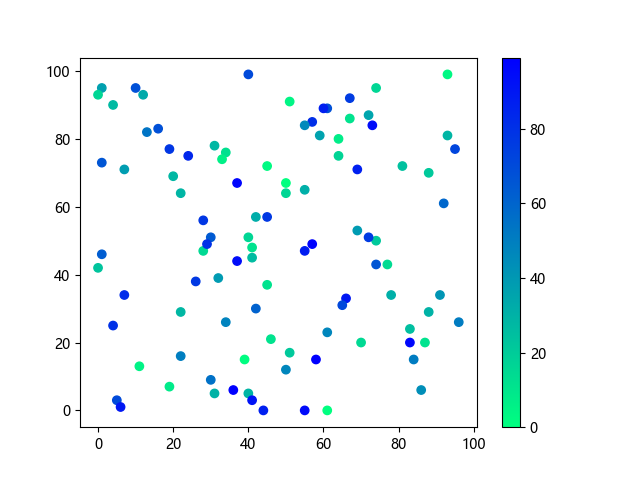 # 以下三行代码使编译器支持绘图功能: import sys import matplotlib matplotlib.use('Agg') import matplotlib.pyplot as plt import numpy as np # 生成随机数据: x = np.random.randint(100, size=(100)) y = np.random.randint(100, size=(100)) colors = np.random.randint(100, size=(100)) # 使用冬季反向 (winter_r) 配色方案创建散点图: plt.scatter(x, y, c=colors, cmap='winter_r') plt.colorbar() plt.show() # 以下两行代码使编译器能够输出图形: plt.savefig(sys.stdout.buffer) # 将图形保存到标准输出缓冲区 sys.stdout.flush() # 刷新输出缓冲区